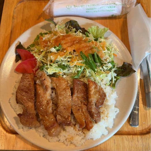 お昼挟んでグランドメルキュールでのイベントに参戦。お昼休みに4〜5分歩いて利用。前回迷ったポークソテーとバターライスを注文。食後にホットコーヒー。前回はぞんざいな接客が目立ったうえにコーヒーが食前に来たが説明も謝罪もなかったのが気に障ったが、今回はどうだろう。心なしか応対がつっけんどんな気もしないでもないが、変なバイアスがかかっているからに違いない。程なくして着皿。バターのいい香り。甘辛く味付けされた豚ロース肉は柔らかくうまい。バターライスは全体にしっとりするくらいバターで、ポークソテーのソースが沁みてうまい。ご飯とソースだけでいけるくらいだ。サラダは大量でキャベツ、レタス、水菜が極細にカットされてて、フォークでも食べやすい。なんかのすりおろしのドレッシングもありきたりじゃない感じ。バターライス、クセになる。お水出しに来てくれたり、ちゃんと食べ終わり見ててくれてコーヒー出すタイミングも今回は完璧。接客は改善されており、不安は取り越し苦労であることがわかり安心。今日はBGMがずっとWes Montgomeryでとても良かった。