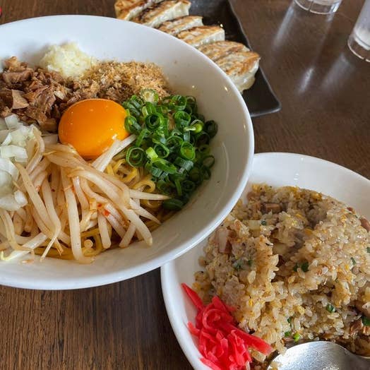 オイリーで角切りチャーシューゴロゴロなチャーハンは胡椒が効いててウンマイ。ラーメンはモヤシ&タマネギがシャキシャキで良いですね。
