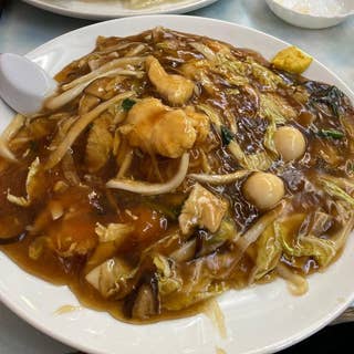 平日ピークタイム前に訪問 五目あんかけ焼きそばを注文しました ランチだからなのかメニューは焼きそばのみでした 1人前が2玉、ハーフが1玉、その下が0.5玉まで選べますが、ハーフや0.5玉にしても100円くらいしか値段が変わらないのが不思議でしたが食べてみてなるほどと思いました。 この店はあんかけ焼きそばを食べに来ると思わせて実はあんかけの餡を食べに来る店です。 麺は少なくなっても餡の量は変わらないように見えるので値段もほぼ変わらないということです。 0.5玉にして追加で米を頼んであんかけ丼にする手もあるなと思いました