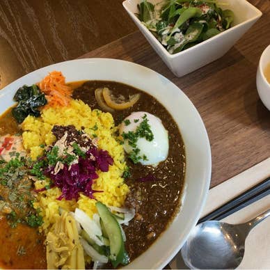 入口の雰囲気から狭いお店なのかと思いましたが、広い空間の開放的なお店でした。 大きい窓からの景色がのどかです。 カレーの口コミを見て、gatiカレーとスパイシーチキンカレーの合いがけを注文。オシャレなプレートです。 どちらのカレーもそれほど辛くなく甘い感じがしました。 gatiカレーの方がなぜか冷めていて残念でした。 セットのアイスコーヒーはとても美味しかったです。