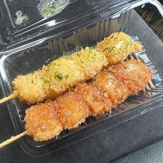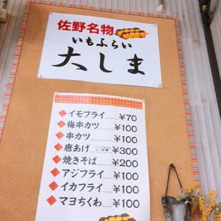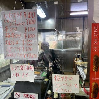 ガーリックバターいもフライ、いもフライ、焼きそば。 栃木県佐野市の佐野駅から車で10分ほどの住宅街にあるいもフライ専門店。 ケンミンショーで見た「ガーリックバターいもフライ」を食べるためにいもフライはしご。 水曜の11:50ごろに着いて先客1名。 値段を見ると1本100円というおやつ価格。 もちろんオリジナルと食べ比べるために両方購入。 焼きそばは数量限定らしい。 大量購入の先客の対応を5分ほど待って着丼。 ガーリックバターから食べてみると、ガーリックの香りとバターの甘味が小ぶりなじゃがいもの甘さと調和して美味い。 王道のソースはフルーツの甘味がある地元のソース。いもフライといえばこのソースで安定感がある。 焼きそばはこのソースを使っているのか若干甘め。 梅を挟んだチキンカツの梅カツ串も人気商品のようだ。 ドライブのお供におやつとして買って食べていくのも良さそう。