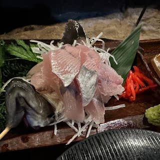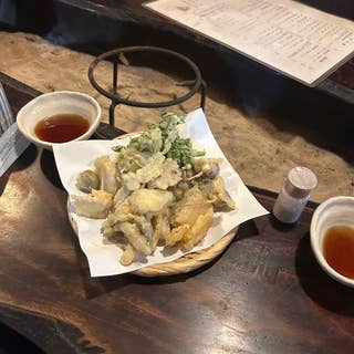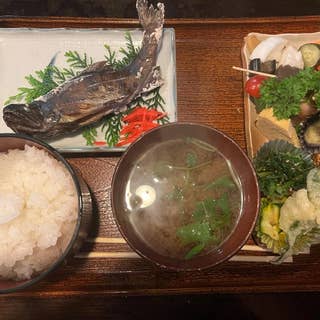 岩魚刺身、岩魚味噌焼き、焼きおにぎり。 群馬県高崎市の山の中、榛名神社から車で2分ほどの山道の途中にある炉端焼き屋。1日30組限定受付。 以前、榛名神社に行く際に見かけて気になっていたお店で、榛名神社に再訪することになったので立ち寄り。 木曜の14:30過ぎに着いて先客3組ほど。 15時最終受付で26組目。雨の平日でこの組数だったので休日は争奪戦かもしれない。 店内に入ると目の前には囲炉裏。 異空間な感じすら受ける。 すぐに席に通され、メニューを見てみる。 ここは「ヤマメの踊り食い」が有名らしい。 隣のお客様がやっていたのをチラ見。 「岩魚の刺身」は食べたことがなかったのと、岩魚の食べ方の原型と言われる「味噌焼き」の定食を注文。 囲炉裏でおにぎりが焼かれてるのをみて食べたくなったのでこれも。 「岩魚は活魚から調理するので時間がかかる」から30分ほど待つ模様。 10分ほどで焼きおにぎりが着丼。 思った以上に大きめのおにぎりだったがカリッと焼かれて香ばしい。囲炉裏焼きの効果なのかふわっと感もある。 30分ほどで岩魚の定食が着丼。 まずは刺身から。川魚特有の臭みは全くなく、身がとても甘い。肉厚に切られてるので弾力も感じられる。 味噌焼きはこれも囲炉裏焼きの効果なのか身はふわっとしてるが旨みの強い皮目はカリッと仕上がってる。味噌の風味で岩魚の甘味が引き立つ。 定食には山菜の天ぷらや地元の惣菜なのかな?もついてくるので楽しい。 平日なら昼時を外せば並ぶこともなさそうなので神社参拝のスタート前に立ち寄りたい。