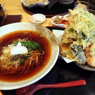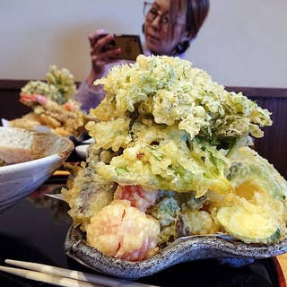 山の幸天ぷらと蕎麦を楽しむ大盛り名物店