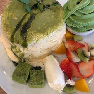 1月22日 羽貫のプランピーパンケーキスで 期間限定の ティラミスパンケーキの抹茶を食べて見ました 3種類あり チョコ いちご 抹茶から選べます 今回は抹茶にしてみました 抹茶は 抹茶ソフト 抹茶わらび餅 味によって組み合わせが違うです パンケーキ廻りにはフルーツがたくさん ふわふわで美味しいです
