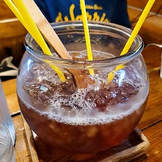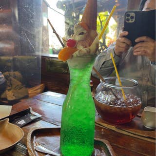 ログハウス風の落ち着いた雰囲気の店内に入ると、大きなパフェやドリンクが目を惹きます。看板メニューのパフェやアイスティは、いずれも規格外の大きさで、アイスティは1.8リットルの金魚鉢、パフェは高さ約50cm・約1キロのクリームソーダと、見た瞬間誰もが笑ってしまうほどのインパクト。パフェはフルーツや2段重ねのアイス、たっぷりの生クリームが盛られており、シェアして食べるのもおすすめです。食事メニューも充実していて、パスタやピザもボリュームたっぷり。遊びの後や家族のお出かけなど、みんなで楽しくシェアできるおすすめのスポットです。