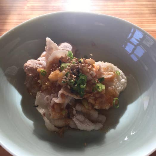 まず、前菜は、豚肉と里芋のネギソース。