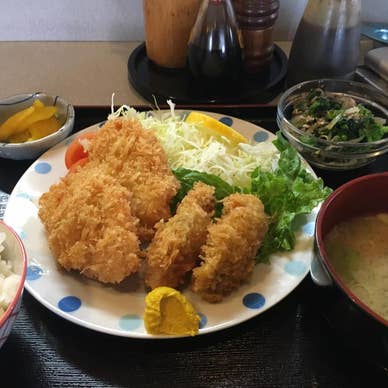 印旛沼のサイクリングコースは、桜が沢山植えられているので、今日はこちらのコースから、利根川を目指すも、途中で足がつってしまい、このお店で食事休憩して帰る事に。 前回は、勝浦坦々麺を頼んだので、今日は定食系をと思い、チキンカツとカキフライの定食、700円。入ってみると、今日はほぼ満席! カウンターに座って、前を見ると旧車会のみなさんの写真が!そういう店なのかなぁ? 暫し待って到着は、ご覧のように、かなりのボリューム!ムネ二枚にカキフライ二個、おひたしもたっぷり。 今日の消費カロリーとトントン? カツはサクサクで美味しかったです。 満腹の中、カロリー消費頑張ります。 田舎の食堂です。