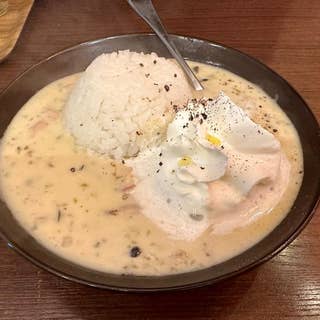日本一のクラムチャウダー(ご飯入りver.) 千葉県船橋市の船橋駅から徒歩5分ほどのところにあるラーメン屋。 「第一回クラムチャウダー選手権優勝&連覇」「アメリカのクラムチャウダー大会優勝」というクラムチャウダーが食べられるお店。船橋のホンビノス貝を使っている。 クラムチャウダーを食べたいと思ってこの店を見つけ、リストに入れて早数年。夜の営業のみなのでなかなか行けるタイミングがなかったが、今回ここに行くために時間を調整して船橋で開店を待って訪問。 火曜の18:15ごろ着いて先客2組。 クラムチャウダーにご飯が入った望み通りのものがメニューにあるので注文。 10分ほどで着丼。 クラムチャウダーにご飯、ホイップバターのようなものが入っている。 チャウダー自体は思ったよりサラッとしていて、ホイップのない部分から食べてみるとあっさりめ。バターを溶かしながら食べていくことでコクが深まる。 単体で食べるには十分だがご飯に合わせるには少々パンチが弱い。卓上には白胡椒はあるが黒胡椒が欲しくなる。 ラーメンや餃子を食べた後の締めとしての一皿にはぴったり。