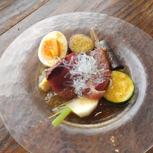 10分もせずに到着!御膳の中身としては、鯛飯、若鶏麹焼き、けんちん汁、お漬物、出汁醤油、生卵、わらび餅と言ったラインナップが並び、おかずが2パターンある感じにデブ心をくすぐられます。まずは鯛飯から。出汁醤油を半分くらいかけて混ぜずに頂くと、うんまい!鯛のプリプリ加減も良く海苔とお野菜、辛さ抑えめの出汁醤油が繊細ながらそれぞれの味をちゃんと楽しめる鯛の海鮮丼と言った逸品に仕上げてくれます。一気に食いそうになるのを我慢してけんちん汁へ。優しい滋味深い味わいながら、鶏と出汁の味がしっかり。口の中を優しさに包まれながらリセットし若鶏麹焼きへ。これまた美味しいすねぇ。皮はパリパリ、弾力のある鶏肉と食感も楽しめるし麹がちゃんと効いていて塩味だけではない深味が感じられます。鯛飯の甘味、けんちん汁の滋味、塩麹の塩味と三位一体でナイスバランス御膳!