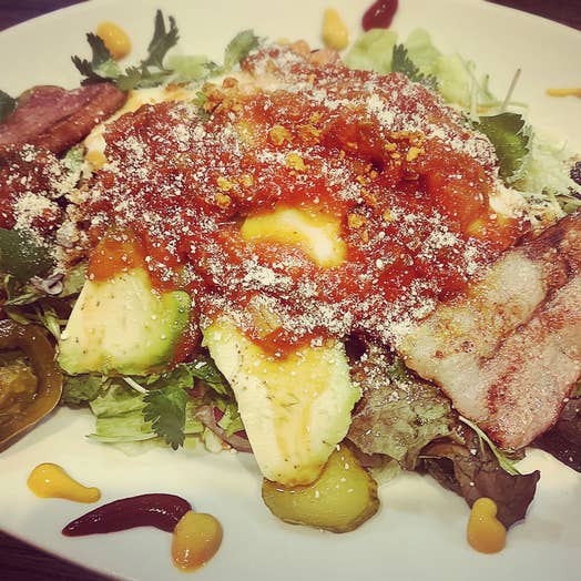 野菜と麸とポークを炒めた素朴な料理。半分ほど食べてからコーレーグースをかけて味にパンチを出してみました。