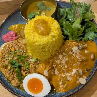 過去一のスパイスカレーかもしれません。 まず、盛り付けから非常に楽しいです。 燻製卵、キーマ、バターチキン、チャツネ、ケールなど盛りだくさんです。 肝心のお味はまろやかで時にぴりっとくるスパイスの味わいが楽しく、醍醐味である相掛けカレーを混ぜていただくのが大変楽しいです。 また来ます!