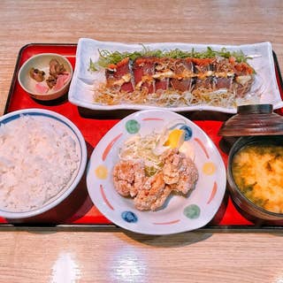 <鰹のっけ盛りと唐揚げ定食 ¥1,100(税込)> カツオは脂がのった戻り鰹より 脂がない赤身でスキッとした味わいの初鰹が好みです。今の時期はまだ初鰹に近く、ポン酢と薬味でさらにサッパリとして、美味〜い♫