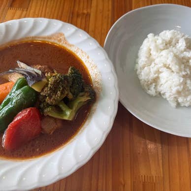 秋葉原の近く、神田須田町の『スープカレー カムイ』さんを久しぶりに訪問しました。 こちらは札幌のスープカレーとは少し違ったオリジナルのスープカレー屋さんと思っていたら、「北海道出身の店主が作る現地の味」とのことでした。やはりルーツは札幌なのですね。 秋葉原最古のスープカレー専門店です。北海道出身の店主の「諸橋カムイ」さんは、ミステリー作家であり劇団の主宰です。 店内にメイド喫茶やアニメのポスターが多く飾られていると思ったら、アイドルやゲームとのコラボイベント2,000回以上開催しているとのこと。そのPRをしているのですね。 一番人気はチキンと5種類の野菜の「チキン野菜カレー」。店主は薬膳コーディネーターの資格を持っているとのことでした。 一番人気の『チキン野菜カレー 1,490円』をいただきました。辛さは「1中辛」、ご飯の量は「普通盛り(200g)」で。 骨無しチキン、人参、ピーマン、茄子、ブロッコリー、イタリアントマトが入った「チキン野菜カレー」。カレースープはたっぷり入っています。 酸味のあるスープが美味しい。トマトの味が強い。辛さ1の中辛は程よい辛さです。 チキンが煮込まれて柔らかい。スプーンでほろっとほぐれるほど。人参も柔らかく煮込まれています。野菜がたくさんで嬉しい。イタリアントマトなんてもう溶けそうなほどトロトロです。 ボリューム十分でした。札幌から出店してきたスープカレー屋さんは何軒も回りましたが、やはり一味違った美味しさのスープカレーでした。
