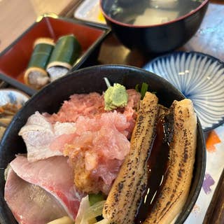 300年以上の長い歴史を持つ老舗で味わうランチは、三色丼や伝統的な押し寿司など、豪華な5点セット。三色丼には、ふわふわに煮上げた穴子、鮮度を感じるネギトロ、脂がしっかりのった炙りカンパチが華やかに盛られています。酒に合うという声もある手仕事のおぼろや酢飯も魅力的。小鉢やお吸い物も丁寧な味付けで、料理の見た目にもこだわりがうかがえます。静かな店内でゆったりと伝統の味に浸れる、満足感の高いお店です。