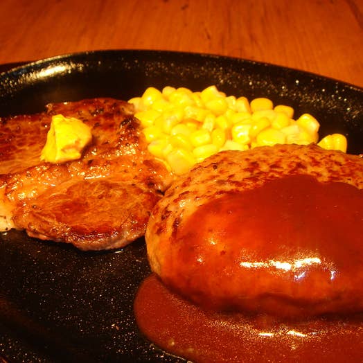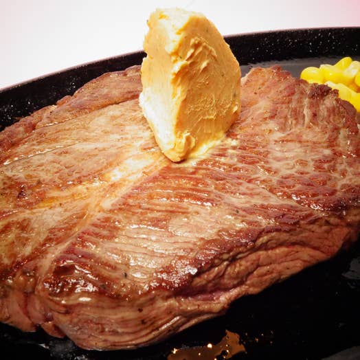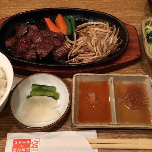 ステーキはわさびのせて食べるのがおすすめ。