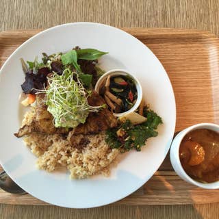 ミッドタウン内にある明るいカフェでは、玄米や雑穀ご飯、カレー、サラダ、ピタサンドなど身体を気遣うメニューが揃っています。大きな窓から街並みを眺めながらのんびり食事ができ、女性客も多く落ち着いた雰囲気。オーガニック系の食品やにごりほうじ茶、ポタージュスープなども楽しめます。Table for twoプロジェクトに参加できるのも嬉しいポイント。健康的な食事をゆったり味わいたい方におすすめです。