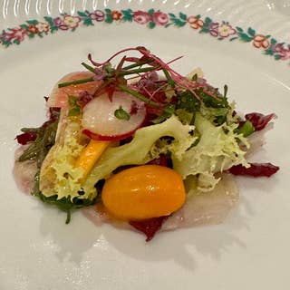 西麻布交差点から広尾方面に歩き、叙々苑の前を通り、ガソリンスタンドの角を曲がって坂を登り掛けると左側のビルの地下にイタリア料理の巨匠の店があり、そこで6000円の「おまかせランチコース」を頂いた。 先ずは、写真#1の「鮮魚のカルパッチョ サラダ仕立て」である。本日の鮮魚は高級魚マハタとのことであった。筋肉質というと表現がアレかもしれないが白身で、弾力がある刺身であった。手前の卵の黄身に見えるのはミニトマト。そして特筆すべきはドレッシングである。オリーブオイルと粒入りマスタードを和えたものであるが、辛子の刺激がほどよくて、単純な組合せなのだが、私には初めて食べた調合具合であった。 写真#2は「とうもろこしの冷製スープ」で、シャンパングラスに入れて供される。赤いのはコンソメのゼリーで、舌触りに変化をもたらす。とうもろこしは山梨県産のゴールドラッシュという品種を用いており、強い甘みと瑞々しさが初夏を感じさせるのである。許されるのであればお替わりが欲しかった。 写真#3、#4は「クレープのラニエリ風」。片岡シェフが旅行先で食べて惚れ込み、それを再現しているようである。ホワイトソースに四種のチーズが溶解混合してナルホドと思う。但し、小さいのであっという間に食べてしまう。大きさが判るようにフォークやナイフと一緒に撮影しておいた。食べ終えたときにもう一つ食べたいという渇望感をもたらしているのは演出なのであろうか。 写真#5は「イカのグリル イカ墨の焼きリゾット」である。写真#6ではイカを取りのけて焼きリゾットを露出させてある。まず、一番上に載せてある下足の焼き具合、香りが絶妙であった。半生なのかと思わせる柔らかさと烏賊のヌルヌル具合が官能的であった。実は下足で大満足してしまい、烏賊の身の方の記憶がない。島根県産のシロイカを使っていると伺った。 さて、「焼きリゾット」である。米の粒が大きいのでインディアカ 米なのかを尋ねたら、イタリア産のカルナローにという高級米だという。粘りが少なく粒も大きく煮崩れしない。やはり、リゾットにはリゾットに適したコメがあるのだと納得した。おじやをセルクルで固めて焼いてあり、そのカリカリ感とおじやのヌルヌル感の対比を楽しんだ。くどいようだが、カリカリの中に烏イカ墨の味が滲み出てくるのが宜しい。 写真#7は、愚妻が頼んだ駿河湾の桜海老のスパゲッティで、キャベツが甘くて美味しいとのこと。メニューには「櫻エビ、キャベツ、カラスミ フェディリー二」と書いてある。最後のフェディリーには細いすぱげてぃのことである。 彼女が言うには相当に野菜にこだわっている店だとのこと。確かに、どの野菜も新鮮に感じた。なお、パスタは5種から選択できる。 写真#8は私の選んだ「茸とブラウンマッシュルームのラグーソース」である。麵は同じくフェディリー二であり、大量のスライスマッシュルームに目を奪われる。メニューには「Fedelini al ragu di fungi」と簡潔に記されているのだが、スライスマッシュルームの歯応えが楽しい。 写真#9は、4択のメインディッシュから選んだ「米沢牛ランプ肉のタリアータ 赤ワインソース」である。上に載せたバルミジャーノ・レッジャーノで勝負は付いた気がした。 写真#10は愚妻が選択した「真鯛のソテー」で、万願寺唐辛子とジャガイモを重ねた上に鯛の身を載せてある。ズッキーニ、オリーブ、ケッパーを使ったソースで味付けしてあるそうである。 写真#11は、桃のコンポートのバニラアイス載せである。フランボアーズソースの上にベアルネーズソースを掛けてあると説明頂いた。二種のソースとは贅沢な一皿である。なお、この皿は6000円のコースに追加料金1650円が追加される。 写真#12は紅茶。 写真#13、頼んだビールはメニューには「イタリア製ビール」と書いてあったが頼んだ二本はそれぞれ違う銘柄であった。但し、玉蜀黍が原材料であり、確かにイタリア旅行の際に飲んだビールの味がした。 写真#14は、片岡シェフと私である。2,023年の9月に横浜で開催された一般社団法人イタリア料理協会主催の「イタリア料理の日2023」で拝顔していたが、会長を務める片岡シェフと一緒に写真に収まるのは光栄であった。