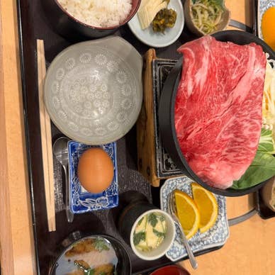 よつ谷さんですき焼き定食をいただきました 大きいお肉がどかーんと目につくビジュアルで すべてがハイスペックなすき焼き とても贅沢なすき焼きと時間を過ごさせていただきました お肉も柔らかく 割下も丁度いい濃さ 茶碗蒸しもオレンジ最高です 大満足過ぎるご馳走様でした。