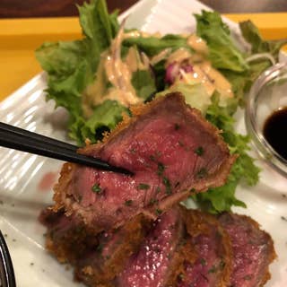久々に田町に降り立ったのでこの日はサラリーマンと肉をかけたこちらのお店へ ランチで伺いました。 注文は 日替わり 900円 この日は牛カツでした。 待つこと数分牛カツが登場 味噌汁、ご飯はおかわり自由です。 メインの牛カツはサクサクの衣とタレ、わさびでシンプルにいただきます。 ジューシーな牛カツの肉感がご飯を進めました。 夜のお酒の取り組みが面白そうなので近隣に務める方は夜も楽しめそうです。