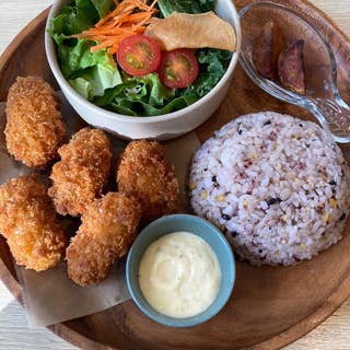 先月末に訪問。カキフライプレートに五穀米。サラダはたっぷり、カキフライは小ぶりでもみっちりと身が詰まってサクサク、美味でした。マヨネーズソースのみなのがユニーク。 人気だというチョコレートケーキも冬らしい濃厚さで、紅茶とよく合いました。