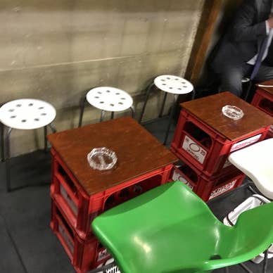 ビールケースで作ったテーブル席が何とも味がある、浜松町の角打ちのお店