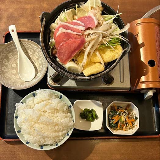 普段は2人前から受け付けるちゃんこ鍋をランチタイム限定の鴨ちゃん小鍋定食1100円をご飯大盛0円で注文しました,小型のカセットコンロに火を付け待ってると2分ほどで沸騰して来ました,自分好みに火を通し屯水に取り分けて頂くと旨塩スープに鴨肉の脂と笹ガキ牛蒡が良く合いオンザライスで楽しみます,出汁を含んだ油揚げや野菜などを残した鍋に残りのご飯をぶっ込んだシメの雑炊で美味しく頂きましたd(´ڡ`๑)連食で次の店に移動します꒰⍢ ꒱⁼³₌₃