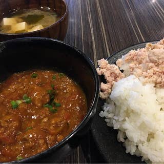 夜一回きたことあるけど、ランチは初めて。 無難にカレーにしてみました。 豚挽肉トマトカレー。 カレーだけど、鳥塩そぼろとり放題(笑) 味噌汁もついてます(^^) そしておかわりも自由!