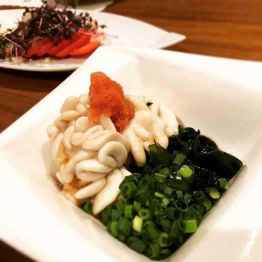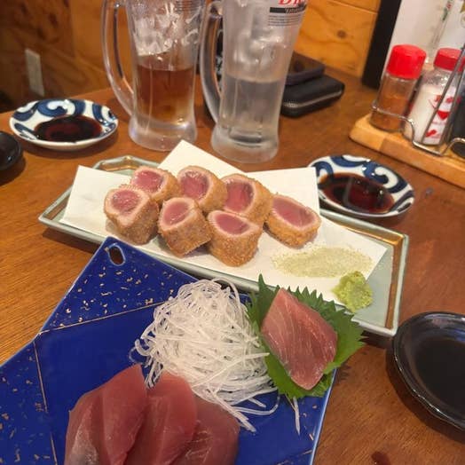 東京都大田区、大森駅北口からすぐのたか濱で飲む。画像は白子ポン酢@780円、白子天ぷら@780円、乙女牛のリブロースステーキ@2280円。