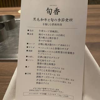個室接待の会食で利用しました。 場所は、カレッタ汐留の46階なので、ローケーションはバッチリです(*'▽'*) 戴いたのは、7000円のコース、旬香「黒毛和牛ステーキ×季節の訪れを愉しむ鉄板和食」で、内容は以下の感じです。 ▪️先付 牛骨スープ茶碗蒸し ▪️前菜 炙り帆立と焼き茄子/柿のマスカルポーネ白和え/本マグロ寿司 ▪️スープ 合鴨と焼き葱のスープ 鉄板仕立て ▪️サラダ マッシュルームと春菊のサラダ ▪️海鮮 金目鯛ムニエルと秋野菜の朴葉焼き ▪️口直し 甘酒と酢橘のグラニテ ▪️メイン 黒毛和牛サーロインステーキ4種の薬味 蓮根黒七味焼き ▪️〆 秋鮭のガーリックライス、又は、牛すじと木耳の焼きそば(選択) ▪️甘味 抹茶アイス/酒粕チーズケーキ バニラアイス/添えきな粉のムース バニラアイス添え(選択) 夜景を見ながら会食は、会話も弾みますね♪ ランチのハンバーグも美味しいみたいなので、今度お昼時にも来てみます! ご馳走様でした( ̄人 ̄)