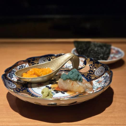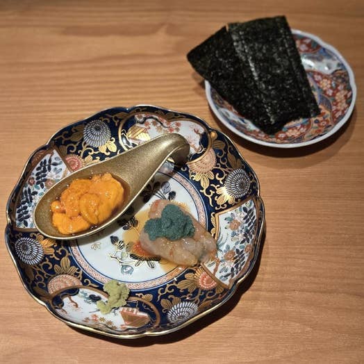・濃厚で甘み強いボタン海老とクリーミーなバフンウニを海苔で巻きながら食べる品