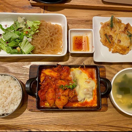 チゲ、サンパ、キンパ、ククスの定食でチヂミ、ナムルがオプションで選べます。