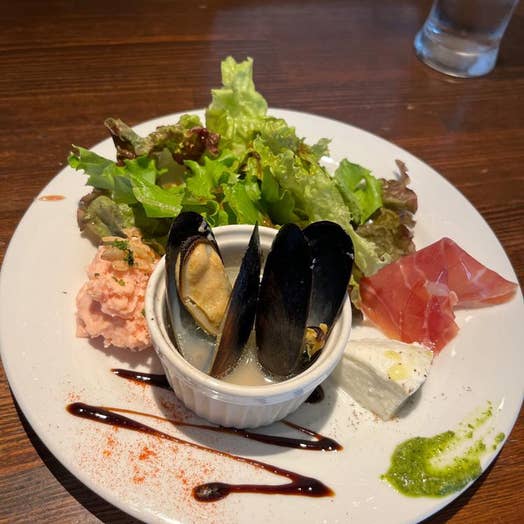 ①前菜盛り合わせ:サーモン、生ハム、リエ