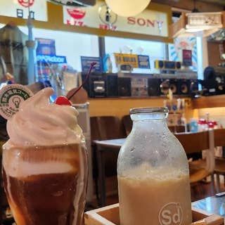 アド街/北千住特集3位! お陰様でテレビ・雑誌新聞・インスタやCM撮影など多くのメディアに掲載いただいております。 店名のSd(エスディ)とはSスズキDデンキの略。S銭湯D大好きの略でもある。 店主実家である『鈴木デンキ』の暖簾を引き継ぎ、電気屋と銭湯のダブルコンセプトで店内をアレンジ。 風呂上がりをイメージした牛乳シェイクと桶に入ったOK!DOGは今や北千住の名物に。 オリジナルグッズや北千住愛が溢れる”北千住土産”が豊富でオンラインショップも大人気! 自家焙煎した厳選豆をハンドドリップで提供する本気の珈琲。 下町らしいホッピー、ビール、ワインと昼からアルコールも豊富。 全席FreeWifiやコンセント完備で快適♪ テラス席は、ペット&喫煙OK! テイクアウトも美味しいよ。