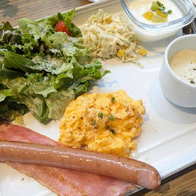 モーニングをっているということで、伺いました(^^) 他店舗でランチで行きましたが、混んでいて、予約してもきっちり時間制なのもあり忙しなかったですが、(人気店ですね☆)こちらでのモーニングは、たまたまかもしれないけど、お客さん少なめでゆっくり出来ました! パン、ワッフル、パンケーキの中から選べました(*^^*) ワッフルは、甘すぎずカリッフワで美味しかったです♪ スープ、サラダ、ソーセージ、飲み物と最高のモーニングでした❁ また、行きたいです(^o^)