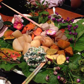 「やまざき酒舗」 2019.4.3 【1534】 清流コース(2,000円込) JR武蔵五日市駅から約4㎞。十里木のT字路を右折してほどなくの場所にある古民家風の食事処兼地酒販売のお店に初訪問しました。 すぐ近くの温泉施設 瀬音の湯 でのんびり入浴を楽しんだ後の昼食に家族さ3人で立ち寄りました。 お店の中はゆったりしたテーブル配置で2組の女性客グループが賑やかに食事中でした。 予約なしで伺ったので奥の大テーブル席へ案内されました。 お昼のメニューは 清流・山里・山ゆり の3コースがあり、山ゆりは予約制になっています。 清流と山里の違いは特製スープが付くか付かないかだそうです。スープは時間がかかるということなので、スープなしの清流コースにしました。 サブメニューには魚か肉が選べるので私と母は魚、娘は肉を注文しました。 はじめに、桜の花や木の葉が咲いた枝とともに綺麗に盛り付けられた野菜煮物ときんぴら、白和えが大皿で提供され取り分けていただきました。 料理は、鰆のマリネ、煮豆、香の物、ご飯、味噌汁がお盆にのせられて提供されます。 肉料理の娘にはポークハムです。 こちらの料理は、秋川渓谷の野菜料理がメインなので煮物が主菜で肉や魚は副菜になりますね。 味がよく染みて形が崩れていない大根、里芋、じゃがいも。とても美味しいです。 きんぴらも細く切られていてフンワリした食感だし、白和えはちょうど良いしっとり感で豆腐の味がしっかりしています。 食後には季節のアイスクリーム(あずき又はのらぼう菜を選択)も出ます。 さっぱりしたアイスクリームで美味しかったです。 お店の方から、今が旬の地元野菜 のらぼう菜を裏の畑から束で切ってきて、人数分プレゼントしてくれました。 ありがとうございます。 癖のない青菜で、御浸しや胡麻和えが美味しいそうです。取りたてはサラダにもできるそうで、試してみたいです。 古民家風の建物ですが、古材ではなく年代物のように加工して、平成4年に建設した比較的新しい店舗なんだそうです。 十分古そうに見えますね。そしてお店でも飲むことができる地酒もお土産用に販売しています。 雰囲気もいいし、落ち着けるお店なのでゆったりと食事ができます。 美味しい野菜料理を楽しめました。 ごちそうさまでした。 #隠れた名店 #ヘルシーメニュー #女性に人気 #野菜料理 #やさしい味 #古民家風の造り #地酒販売 #のらぼう菜(地元名産)のサービスあり