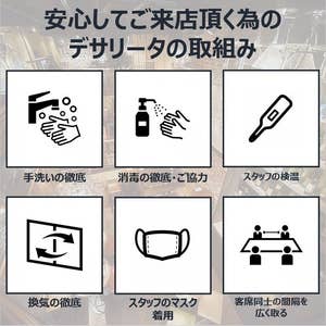当店では、コロナ感染防止対策としまして、手洗い、消毒、検温、換気、マスク着用を徹底しております。 また、お客様へは消毒・客席同士の間隔を広く開けて頂くご協力をお願いしております。 安心してご利用頂けますよう、スタッフ一同細心の注意を払い営業させて頂きます。