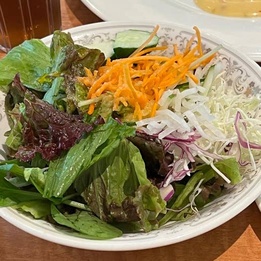 周りの黄色いアスパラガスのようなものは、椰子の芽ですね、ジャワニーズドレッシングも良い感じ