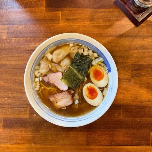 供直前に炙ることで香ばしさアップ、とても美味しいです。ワンタンは皮がツルツルで肉餡は生姜とコショウの効いていてこれも美味しい。たんたん亭系はこれだね!味玉もしっかりと味付けされ美味しいです。