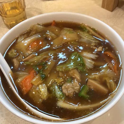 エプロンをもらって、好きな席について待っていると、しばらくしてお兄さんが持ってきてくれたどんぶりにはたっぷりなスープと具材が入っている。食べ進むとかなりのボリューム。しかしながら、とても美味しい優しいスープだった。小鉢に入れたのは麻湯で、ちょっと麺を付けて食べたら舌が痺れた。正直スープをそのまま味わうので十分に思う。取った具材の量も自分にはちょうどいい感じ。