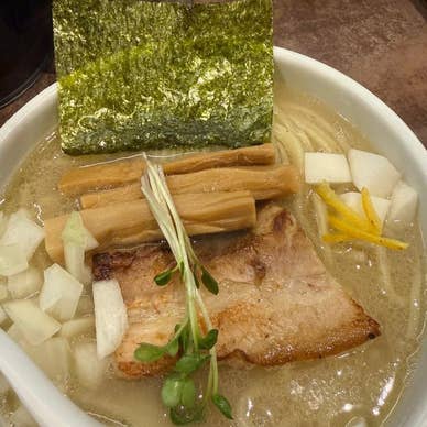 池袋駅から徒歩圏内のラーメン店。名物は淡麗と濃厚を選べるホタテ出汁のラーメンやつけ麺で、鶏白湯ベースにホタテの旨味が重なったスープが自慢です。全粒粉入りのもちもち麺との相性は抜群で、角切り大根や玉ねぎ、柚子といったさっぱりしたトッピングがバランスを引き立てます。炙りチャーシューやシャキシャキのメンマ、味玉など素材にもこだわりあり。麺の量は並・中・大盛無料でボリュームも十分。店内は清潔感がありカフェのようにおしゃれで、女性やお一人様も入りやすい雰囲気です。アルコールに合うおつまみ3点盛りなどサイドメニューも好評で、スタッフの気配りも行き届いています。池袋で美味しい魚介ラーメンや麺料理、お酒とおつまみを楽しみたい方にぴったりのお店です。