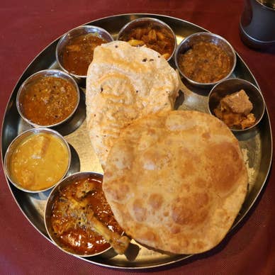 カレー ラーメン 中華 1000投稿 Ryoichi Motoi 南インド料理 A-Raj (エー・ラージ)@東池袋 久々にエーラージへ。やはりここに来たらお得なノンベジミールスを頼んじゃいますね。 ノンベジタリアンミールス(1,500円) お肉のカレー3種と日替わりのカレー3種、ライス、パパド、プーリ、さらにデザートにアイスもついてボリュームたっぷり! カレーがそれぞれに旨いのはもちろん、このプーリが香ばしくてまた美味い!紅茶の香りもします。 食後にマサラチャイ(400円)も注文。 ラージさんが目の前で砂糖入れて高い位置から3回注いでたててくれ、これまた絶品です! やはり名店ですね。 時々インド恋しくて臨休してますがやってたら入りたくなっちゃいます。 ご馳走様でした!
