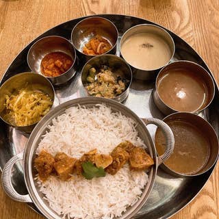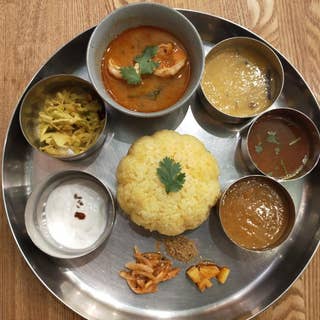 再訪。 暑かったので、冷やしミールス。 冷やしカレーは初めてですが、美味しいですね。冷やしラッサムは普段の温かいものより酸味が鮮烈に感じられ、ご飯が進みます。 ダールもポタージュに似ていて、結婚甘く感じました。 なんとパズマティライスはお代わりできるらしいですよ。