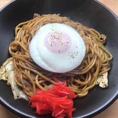 下北沢で乗り換えついでにランチ。粉物好きとして気になっていた、焼そば専門店に寄ってみました。 小さなビルの2階にある、モダンな雰囲気のお店です。入り口を入って券売機で、焼そば(¥750)の大盛り(+¥100)に目玉焼き追加(+¥50)を購入。カウンター席に座りました。 麺は茹で立てをフライパンでじっくり炒めるため時間がかかります。配膳された焼そばは極太麺に程よい焦げ目。三河屋製麺のコシが強い極太麺を使い、食べ応えがあります。 目玉焼き2個は華やかな雰囲気。フルーティなソースの焼そばに黄身を割って混ぜるとより円やかな味になります。 ソース焼そば好きには堪らないお店です。 #粉物万歳