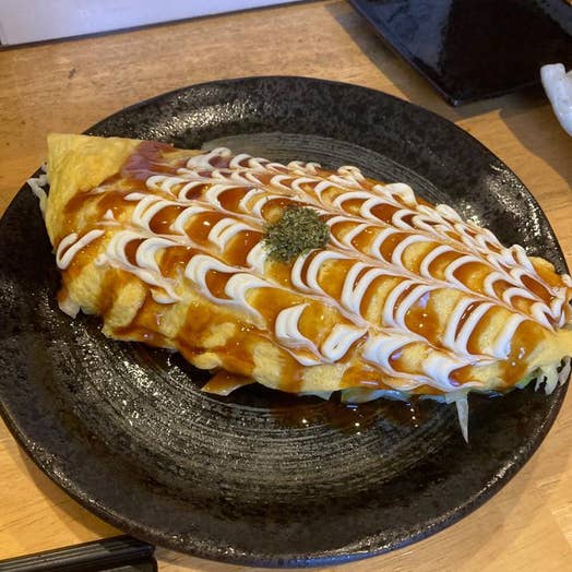 玉子の薄焼きの中にたっぷりキャベツと豚肉。