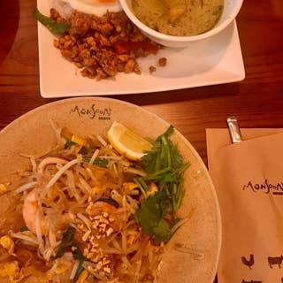TOP USER恵比寿 居酒屋 ビュッフェ しゃぶしゃぶ 1000投稿 Kazuyoshi Koshiyama タイ料理モンスーンカフェ。もう何十年も前からありますよね。 恵比寿にある、雰囲気の良い、シャレたタイ料理店です(^^) 12:00ちょうど頃に入店し、カウンター席に着席。 L字型カウンター席の他に、テーブル席が並びに、落ち着いているもののシャレた空気感が漂う、良い雰囲気のお店。 ランチメニューは、メインが6種類から選べ、サラダとジャスミンティーが付くサラダセット(1200円)か、それにタイ海老トーストも付くモンスーンセット(1500円)。 メインをパッタイにして、サラダセットで。 すぐにジャスミンティーが提供されて、その後待って待って26分… やっと、パッタイが提供されました。 さすがに、ちょっと遅すぎ(^^;; パッタイは、イカ、エビ、厚揚げ、玉子、モヤシ、パクチーが入り、甘酸っぱい味わい。 量は少なめ。 美味しいけれど、時間がない腹ペコリーマン向けではないな、と。 どおりで、店内におじさん客がいないと思った…(^^;; ゆっくりとランチができる女性向けな感じですね。 #タイ料理