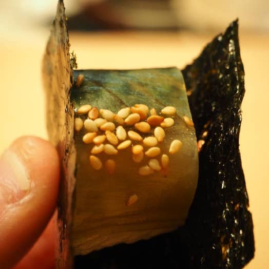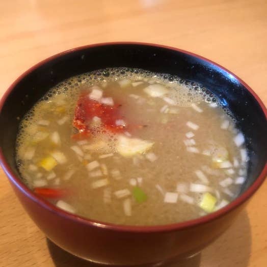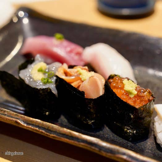 ちょっと待っているとワンプレートでお鮨、そしてお味噌汁が出てくる。お鮨は握りが6貫、海苔で巻いたタイプが2貫、軍艦が3貫。そして玉と巻物。握りは光り物がコハダかな。その他もかなりいいレベル。より良かったのは軍艦。しらすに赤貝のひも、そしていくら。この3連発は良かった。