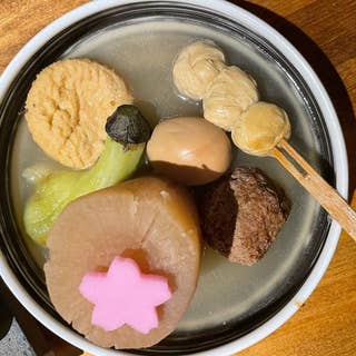 LINE CUBE SHIBUYAでのライブの後に食べるところを探していて見つけたお店。なかなか分かりにくい雑居ビルの4F。でも中はコンセプトを感じさせる。お皿やグラスに店の名前があしらわれていたり、天井も枡や提灯が散りばめられていたりなかなかな空間。 牛だしのおでんのお店ということで、おでんが主力。ハンバーグとか湯葉とか目新しい具材もあるが、大大根や味しみたまごといったおでん定番具材も良い味だ。たまごってパックで200円が頭にあっていつも「高いなぁ」と思うのだが、ここのは味の染み込ませ方が秀逸でグッド。ハンバーグもミニサイズだがグュッと旨みが凝縮されていて美味い。おつまみメニューも色々あって悩ませる。でも個人的にはおでんが好き。 いい店だったけど立地があまり好きでないこと、椅子が硬くてお尻が痛いこと、飲み物が高いこと(おまけに最後に熱いお茶欲しいと言ったらソフトドリンクのウーロン茶や緑茶を温めるしかないとな。ソフトドリンクも安くなかったし)がマイナス点。