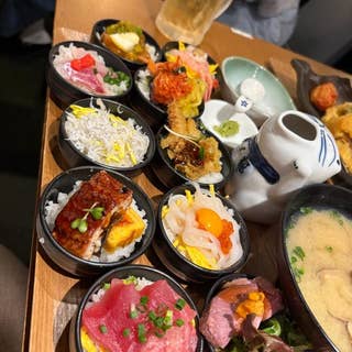 ~おちょこ丼&手巻き8種セット ◆あおぎりみかん山椒ソーダ 私がオーダーしたドリンク、 山椒の風味がしっかり効いて すっきりとした大人のオレンジジュース 甘すぎずお食事にもめっちゃ合う ◆お友達がオーダーしたのは 見た目は貴族の高級ワインだけど アランミリアカベルネという ぶどうジュース 一口頂いたら 後味がすっきりな軽いぶどうジュースでした どちらも美味しかった、 ドリンクだけでも 大満足な私達ですが お料理も すごかった~ 色々なものがちょっとずつ 見た目にも可愛いし 贅沢な具材もいっぱい どれから食べようか迷う~ ●手巻き寿司4種 とろたく手巻き (ねぎとろ・たくあん・焼き海苔) サーモンいくら手巻き (サーモン・いくら・焼き海苔) うな玉手巻き (うなぎ・厚焼き玉子・焼き海苔) まぐろ三昧手巻き (まぐろ・ねぎとろ・焼き海苔) ●おちょこ丼4種 白身魚とネギ明太丼 (白身魚・ねぎ・明太子) あまえびとかに丼 (甘えび・かに・厚焼き玉子) 鶏そぼろの親子丼 (鶏そぼろ・うずらの卵・ねぎ) ローストポーク丼 (ローストポーク・キャビア・レタス) とにかく色々なものをちょっとずつ食べられて 欲張りには最高 さらにあおさのお味噌汁とお漬物も付いていました お醤油もこだわりを感じる 店内もオシャレで素敵なお店でした。