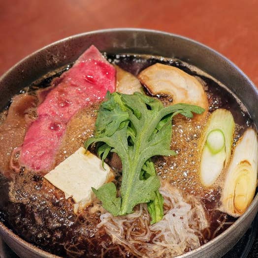 すき焼にするための、牛骨ベースの出汁が入った専用鍋が出て来ます。