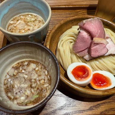 つけ汁2種味玉つけめん+黒毛和牛サーロインご飯セットを注文。 まずは着座後、鍋で黒毛和牛のサーロインを調理してライスと共に提供してくれます。卵をくぐらせて食べると、柔らかさと旨みが口の中でとろけ、至福のひと時を味わえます。これがメイン?と思うほど美味しいです。 続けて、つけ汁とつけ麺の提供。つけ汁は予めヒアリングを受けており4種から2種選べて、海老と魚をチョイス。麺は釜揚げか冷や盛りを選べて今回は冷や盛りをチョイスし、300gとまぁまぁなボリューム。チャーシューは豚肩、豚バラ、鴨の3種が入っていて食べ比べしながら頂けます。もっちり麺に、つけ汁も交互に味わいながら食べれるのでお得ですね。卓上の海老の辛味を加え、味変しながら美味しく頂きました。スープ割もセルフで楽しめます。 行列が出来ている場合は順番に並び、店員が前から順に伺うので、声がけがあったら食券を購入するシステムです。半数以上が外国人客でした。5組以内なら待つ価値あります。